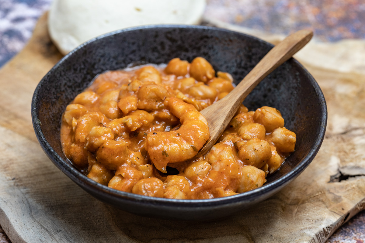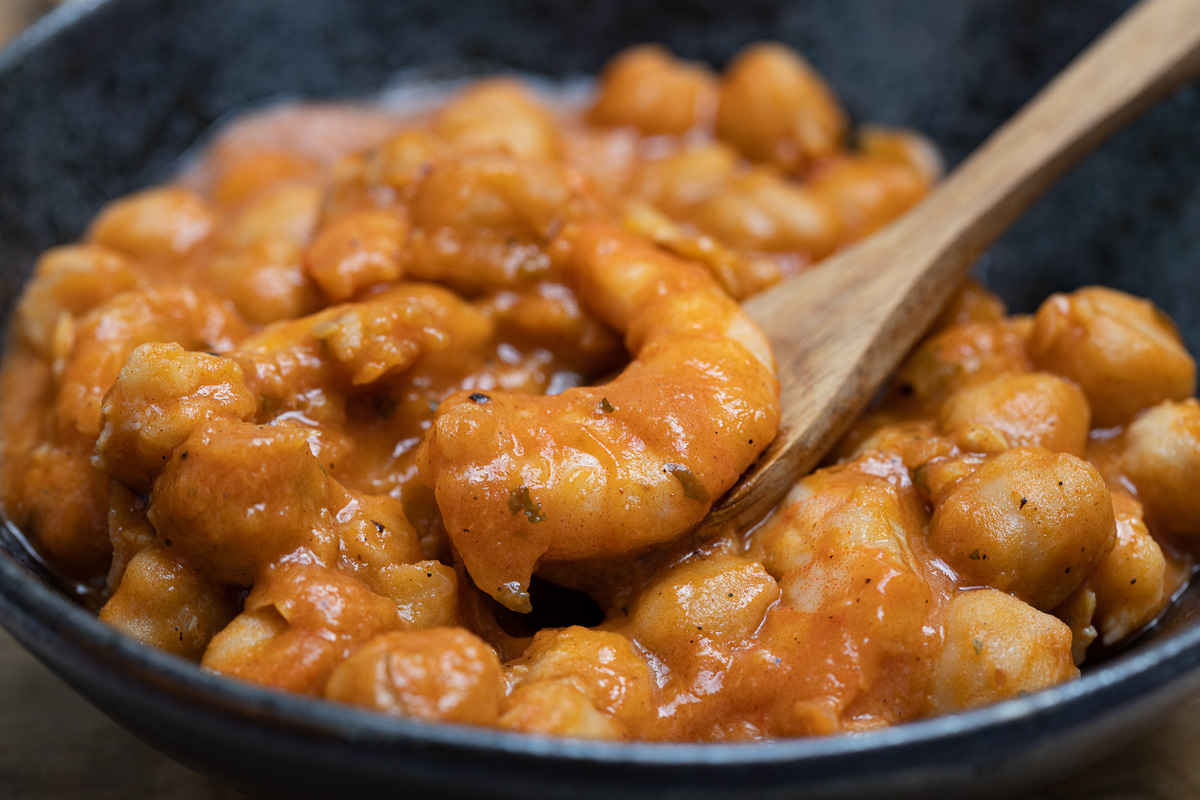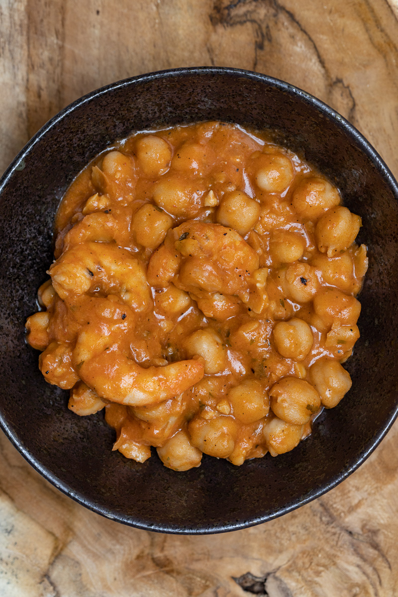 Garbanzos, Langostinos, Sal, Pimienta, Cebolla, Pimentón, Ajo, Harina de Trigo, Pimiento Rojo, Ñora, Tomate, Aceite de Oliva Virgen Extra