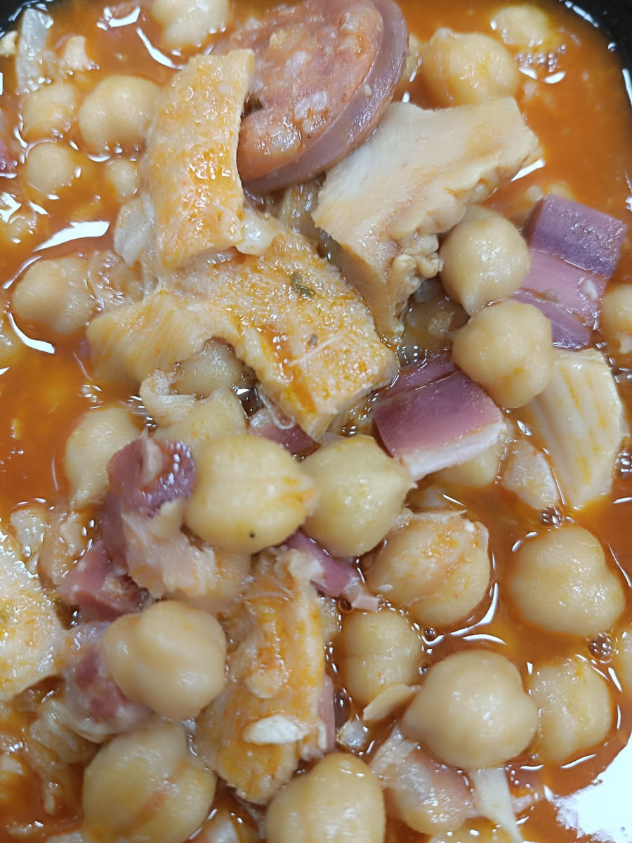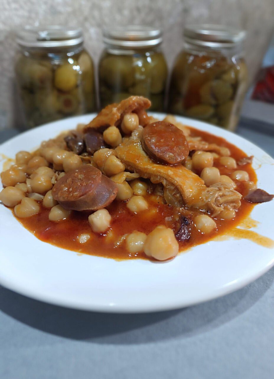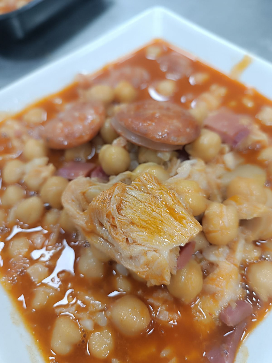 Garbanzos, Callos de Cerdo y Ternera, Sal, Pimienta, Tomate, Tocino de Cerdo, Especias, Pimentón, Ajo, Cebolla, Pan, Hierbabuena, Jamón Curado, Chorizo, Aceite de Oliva Virgen Extra